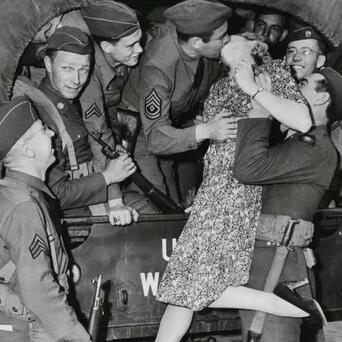 1940年代,一名士兵举起一名年轻的女人,将她送给卡车上的大兵。这名大兵不但亲吻她的嘴唇,甚至将手放在了她的腰间,这名女子不是车上那名大兵的情人,也不是风尘女子。