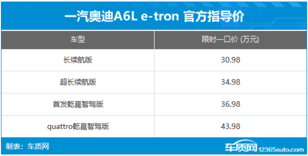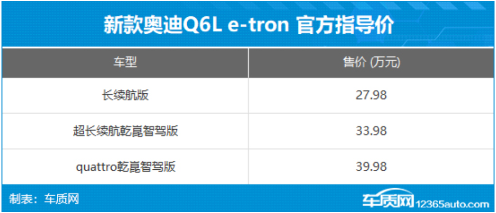2026年4月10日,一汽奥迪官方宣布,新款奥迪Q6L e-tron正式上市,共推出3款车型,官方指导价27.98-39.98万元,限时心动价26.98-38.98万元。作为改款车型,新车重点针对配置和续航进行了升级,增加quattro乾崑智驾版和长续航版两款车型,同时入门车型价格也有所下调。