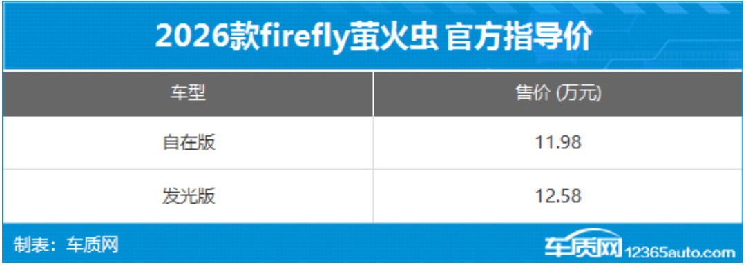 4月7日,2026款firefly萤火虫正式上市。作为年度改款,新车在外观、内饰以及动力系统方面均有升级。此次上市新车共推出2款车型,官方指导价为11.98-12.58万元,若采用租电方案则售价为7.98-8.58万元。