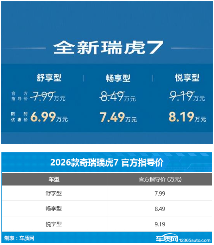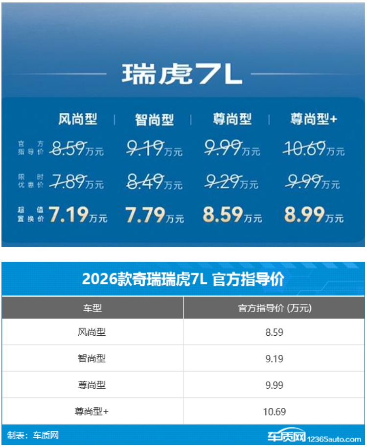 4月8日,2026款奇瑞瑞虎7L正式上市,新车共推出X款车型,官方指导价为8.59-10.69万元,超值置换价下探至7.19-8.99万元。此外,官方还推出流量礼、质保礼等多项购车礼遇。