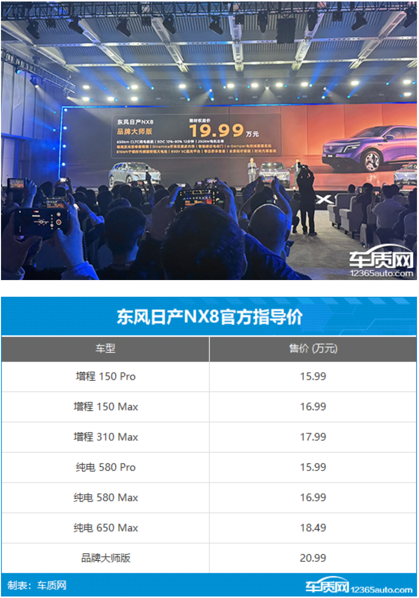 4月8日,东风日产NX8正式上市,此次共推出7款车型,其中包含一款NX8品牌大师版,售价15.99-20.99万元,限时权益价14.99-19.99万元。新车定位中大型SUV,并基于全新全栈自研的天演架构2.0打造,拥有800V高压平台、宁德时代5C超充等技术,动力上则提供增程和纯电两种动力形式。
