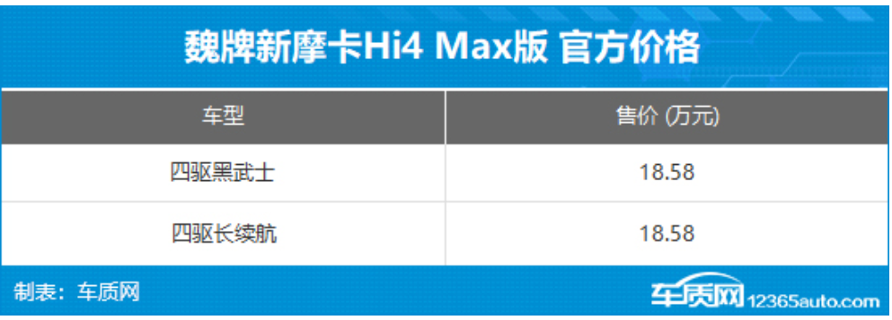 4月10日,车质网获悉,魏牌新摩卡Hi4 Max版已正式上市,新车推出四驱黑武士与四驱长续航两款车型,统一售价18.58万元。官方推出多重购车权益,4月30日前下订可享6000元增换购补贴,5年贷款前两年0息,首任车主2年内免费提供充电桩及基础安装服务,娱乐流量3年免费。