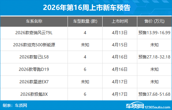 2026年第16周 (4月13日-4月19日)上市新车预告