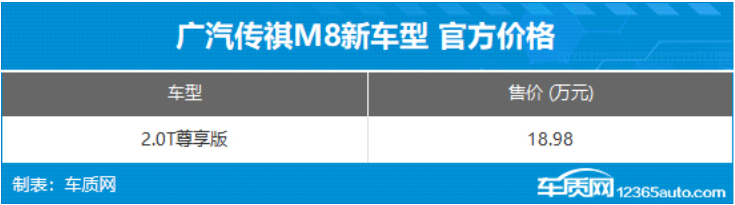 4月8日,广汽传祺2026款M8新增2.0T尊享版正式上市,官方指导价18.98万元,政企双补后低至16.98万元,进一步降低中大型豪华MPV入门门槛。