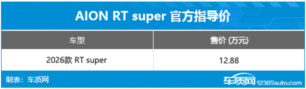 4月8日,AION RT super正式上市,新车共推出1款车型,官方指导价为12.88万元,电池租用购车售价为8.88万元。同时,官方还推出超级金融礼、超级租金礼等上市权益。