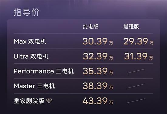 纯电版车型使用全域800V碳化硅平台,后置双电机版电动机总功率502kW,总扭矩750N·m;三电机版车型电动机总功率712kW,总扭矩996N·m。匹配能量为98.07kWh的麒麟6C超充三元锂电池,CLTC纯电续航里程分别为735km和670km。